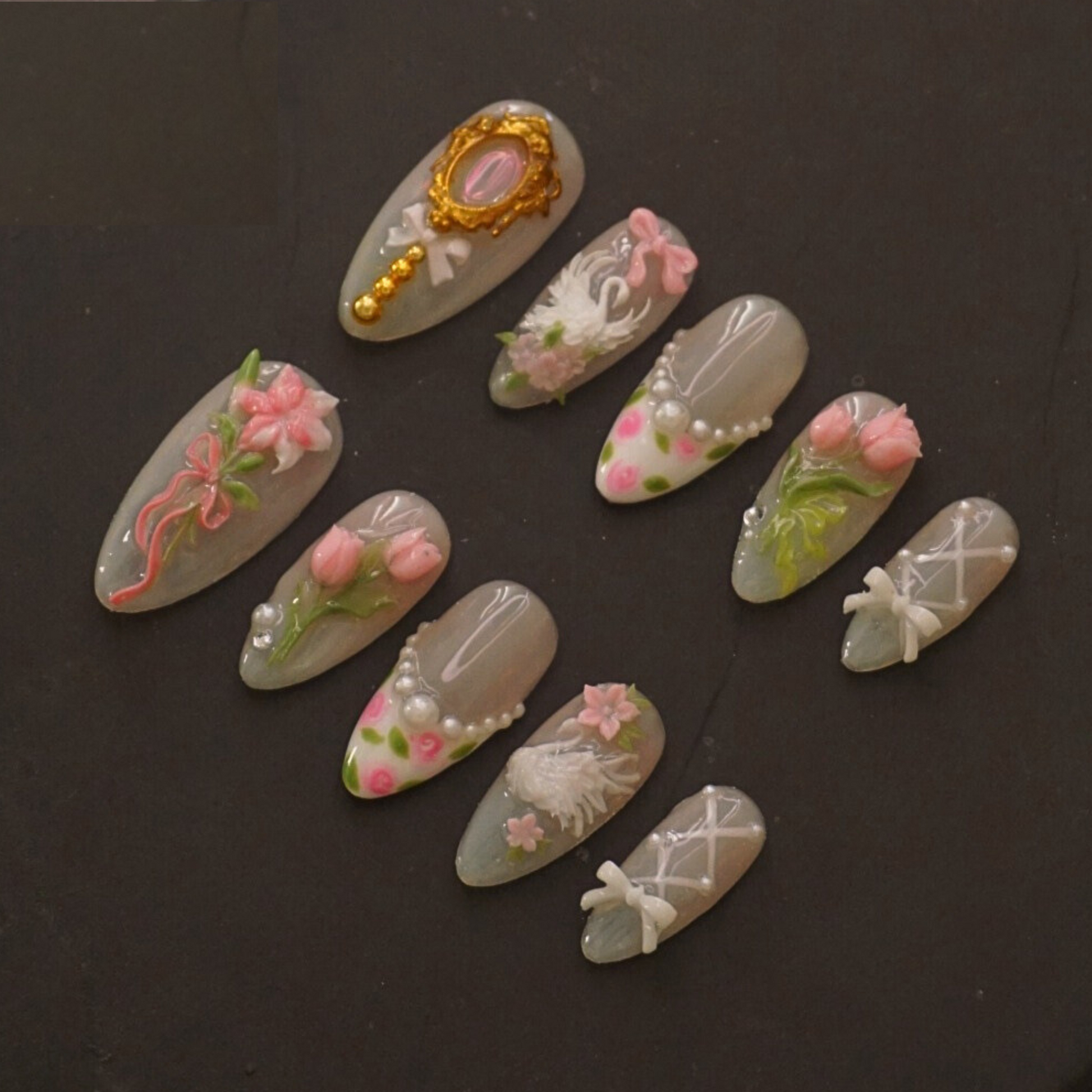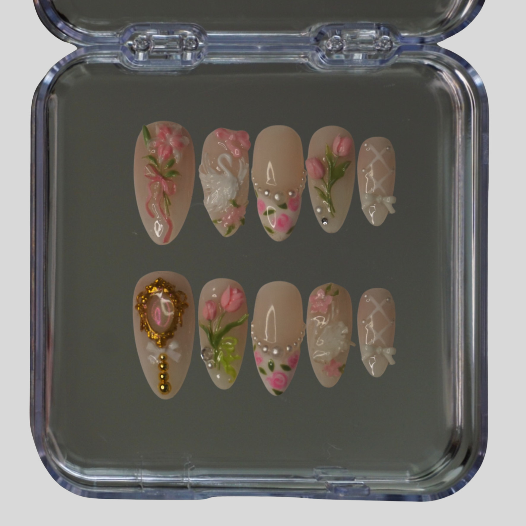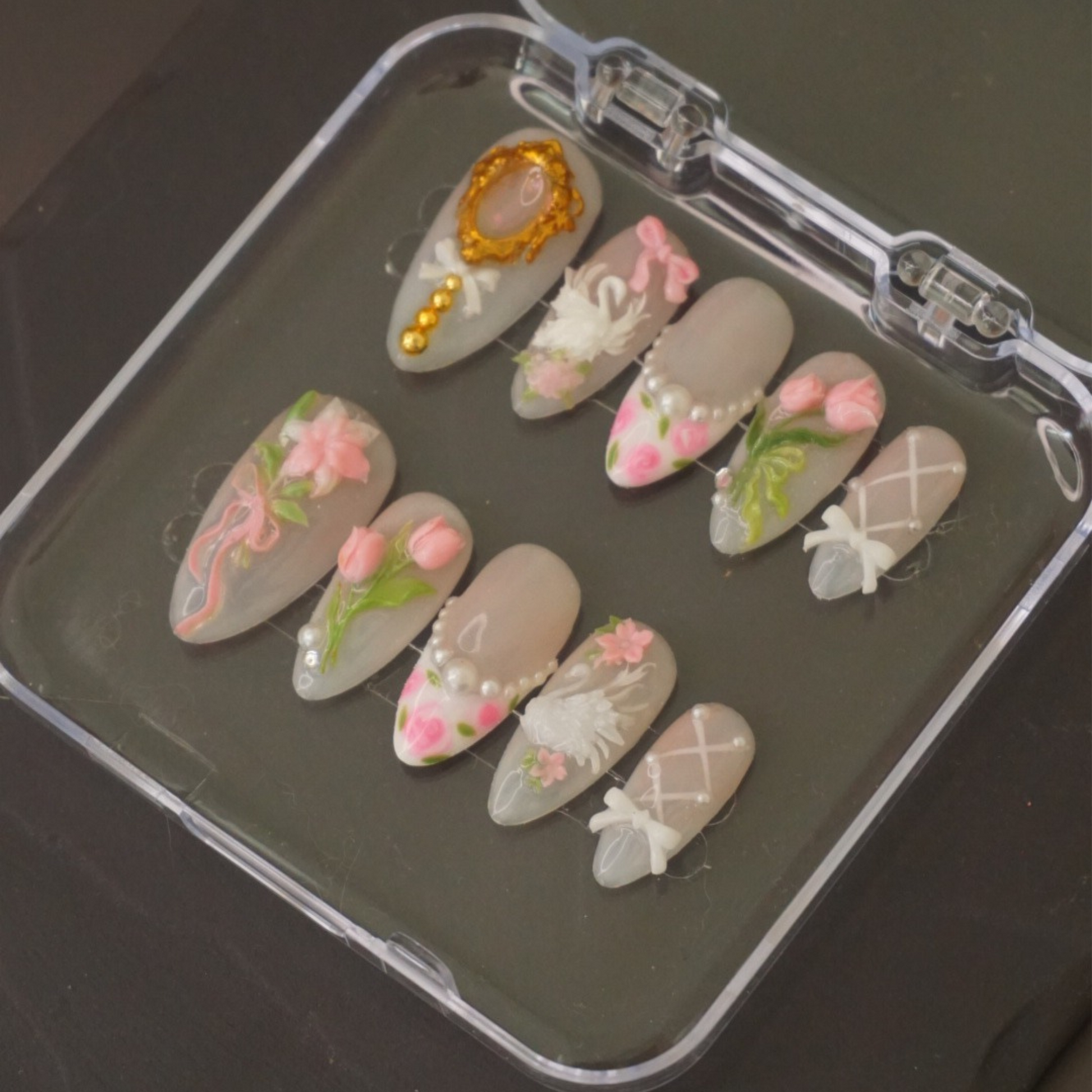 Graceful like a dancer, soft like a bloom. Ballet Bloom is inspired by the elegance of ballet—delicate floral touches meet a dreamy, feminine palette for a look that’s both cute and refined. Perfect for those who love a soft, romantic vibe with a hint of playful charm. Our Press-On Nails are handmade with salon-grade gel and are reusable for multiple wears.